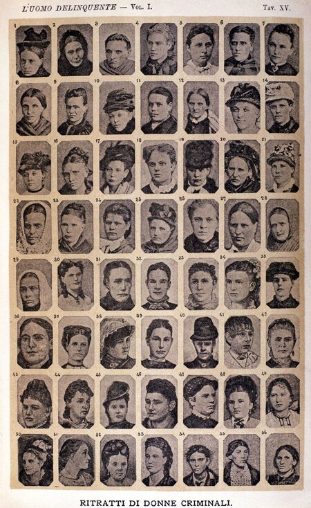 Ломброзо также классифицировал женщин-преступниц. Он утверждал, что они обладают «мужскими» чертами: выступающая челюсть, крупные уши, грубые черты лица, низкий голос[12]. На таблицах из его атласа — фотографии женщин в анфас и профиль, с рукописными пометками о физических особенностях: «отсутствие мочек ушей», «вертикальная морщина», «маскулинность». Визуализация превращает индивидуальность в диагноз.