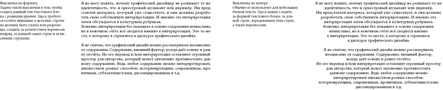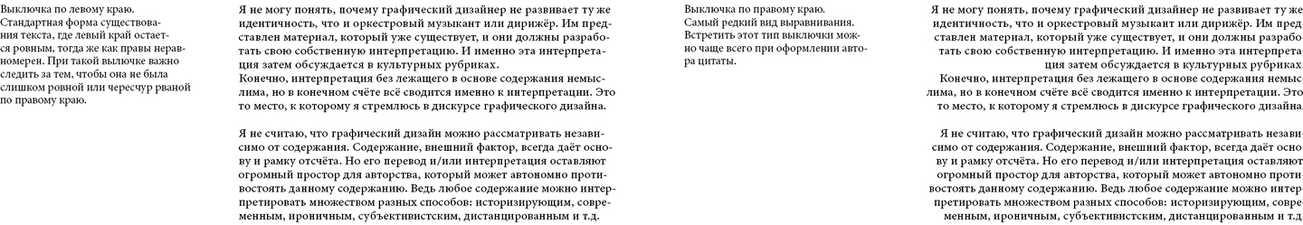 Примеры выравнивания текста, фрагмент из печатного издания визуального исследования. Примеры набраны самостоятельно.