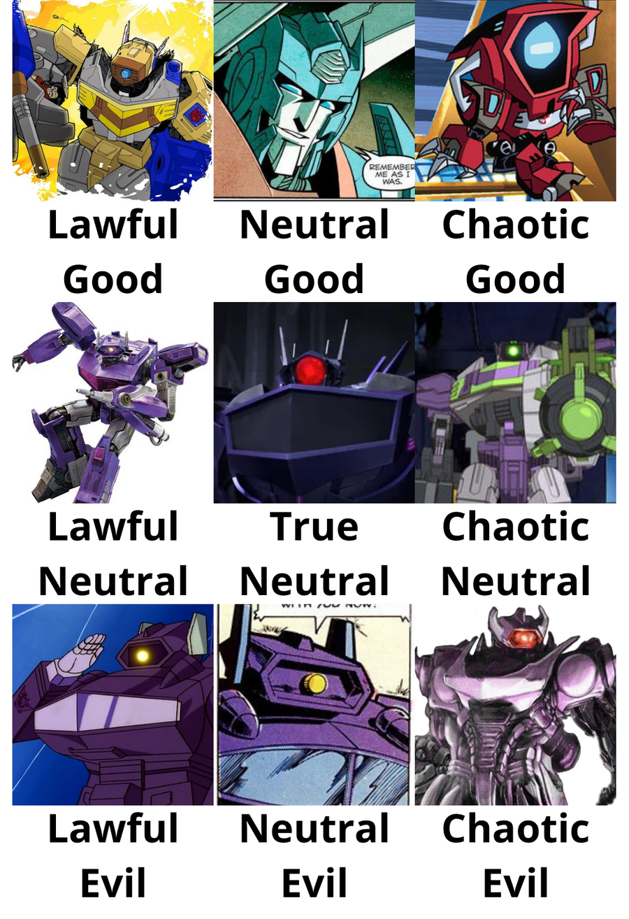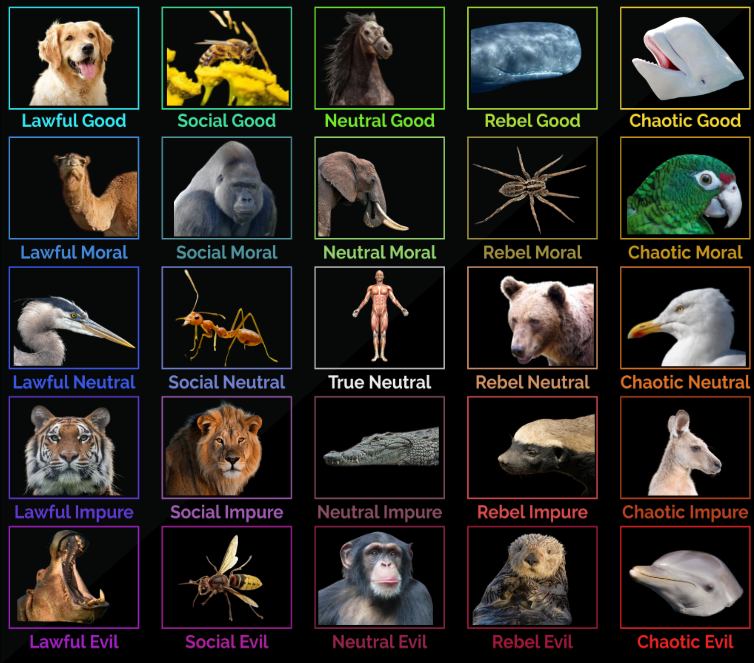 Подборка мемов, созданных пользователями Reddit, «Alignment Chart» — таблица из девяти клеток, куда обычно помещают персонажей или людей по двум осям.