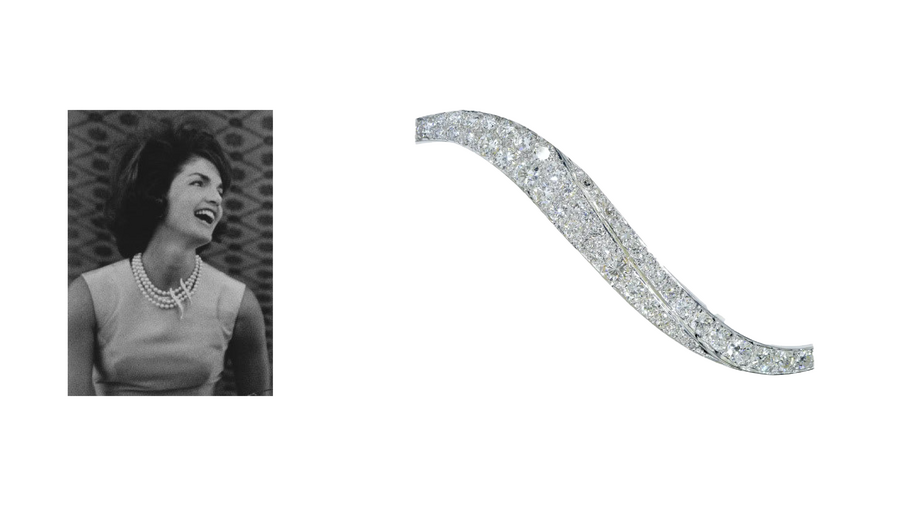 Автор неизвестен, Жаклин Кеннеди с брошью «Flame» на жемчужном ожерелье (XX век) / автор неизвестен, Platinum, Gold and Diamond «Flamme» Vintage Brooch/Hair Barrette (1960 г.) / Flower Brooch (1950 г)