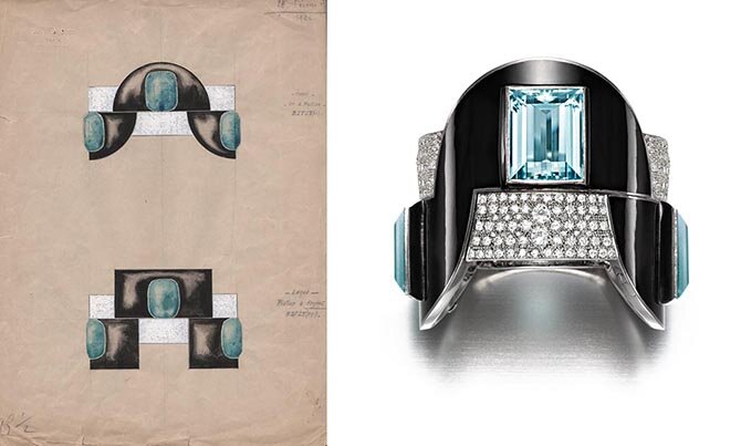 1-2. Жерар Сандоз, брошь в стиле Ар-Деко (1927 г.) / подвеска (1929 г.) / 3-5. Жан Фуке, булавка для жабо (1935 г.) / эскиз браслета-манжета и браслет-манжета (1925 г.)