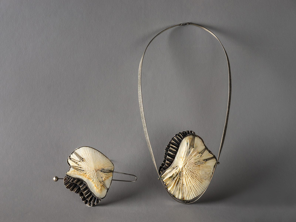 Д. Дидур, колье «Медаль за бесчестье» (1983 г.) / Геннадий Быков, брошь из серии «Бионика» (1998 г.)