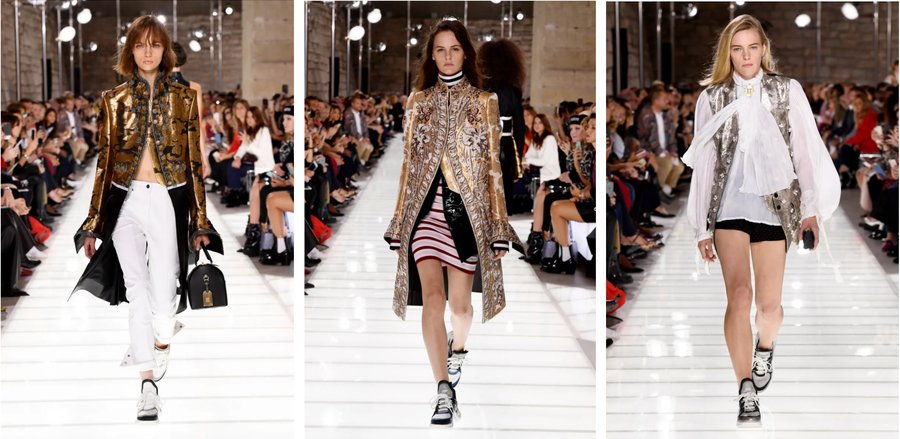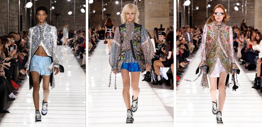 Когда прямое воспроизведение становится общим языком, мода неизбежно переходит в область спектакля — она начинает разыгрывать историю как настоящее. Подиум превращается в сцену, где эпохи наслаиваются без попытки реконструкции контекста. Louis Vuitton SS2018 ставит на подиуме XVIII век: фраки, жабо и кроссовки соединяются в одном кадре, создавая пространство анахронии, где «аристократизм» превращается в элемент уличной одежды.