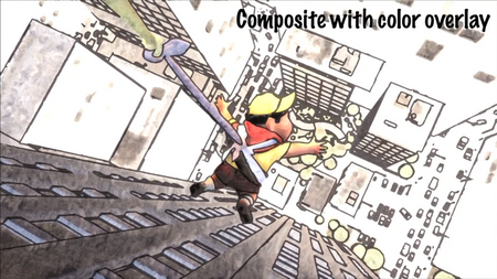 Здесь художник рисует ключевые кадры 20 и 34, используя в качестве референса рендеры (в рамках). Перенос ключевых кадров в промежуточный кадр 27 даёт неполные результаты из-за перекрытий (части тела персонажа) и противоречий, вызванных различиями в цветовых решениях художника (лицо). Данный метод заполняет неполные области и подбирает подходящее сочетание цветов в конфликтующих областях.