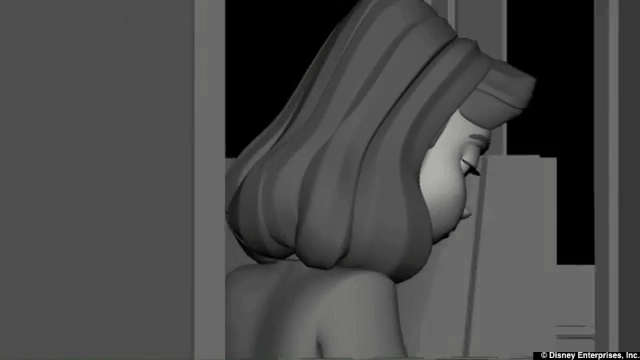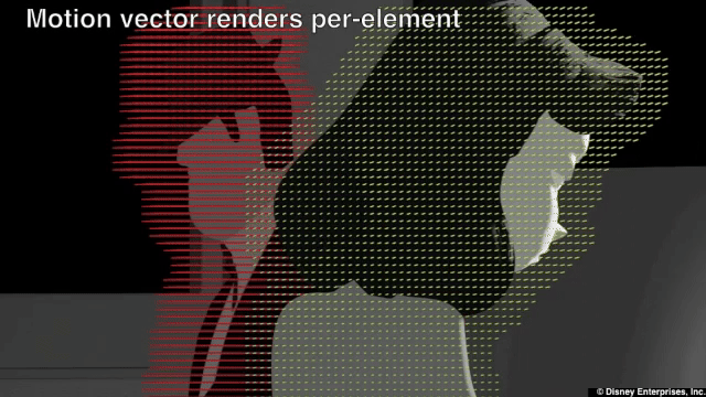 Пайплайн работы здесь более аккуратный и глубокий, по сравнению с представленным в докладе. Например, чтобы изобразить правдоподобную и последовательную графичность, художники разных департаментов создают обычную для них трехмерную анимацию (лейаут, моделлинг, риггинг, непосредственно анимация), а затем из полученного 2D-рендера высчитываются вектора движения каждого элемента на картинке. Их относительное перемещение и позволяет создать более последовательные текстуры, следующие за движением элемента: один и тот же «мазок кисти» на волосах героини сидит на своем месте, как бы она ни двигалась.