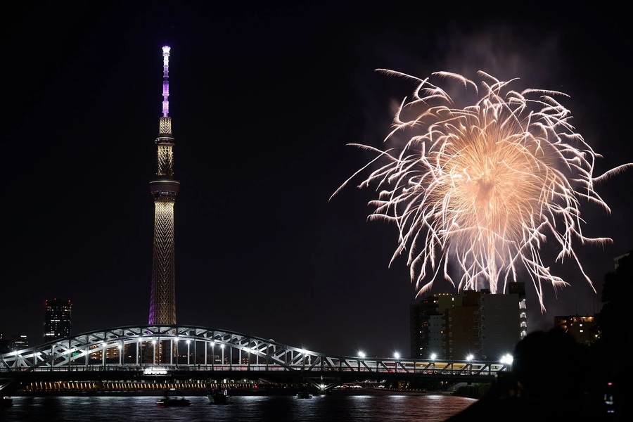 Ключевой атрибут: Фейерверк над руслом Сумиды — залпы с двух площадок и их отражение в воде, формирующие ось небо-река-город.