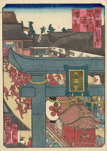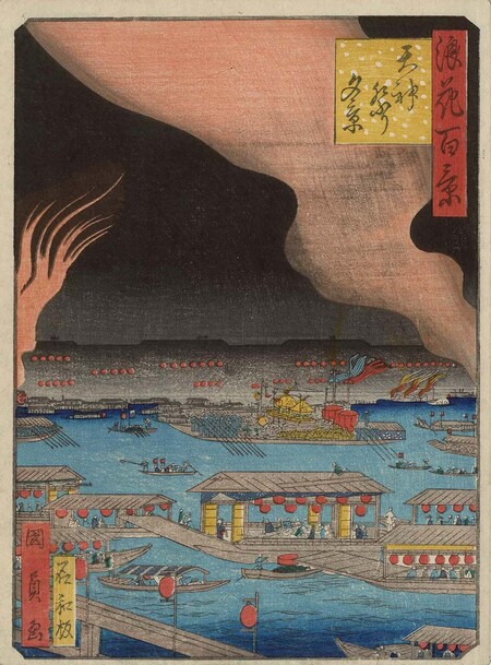 Тэндзин-мацури — это праздник, посвящённый почитанию учёности. Дух Тэндзина выходит из святилища, торжественно проходит по улицам и реке, а затем возвращается под звуки благодарственных возгласов. В укиё-э этот праздник передаётся через длинные шественные линии. Ритм задаётся вертикалями фонарей и мачт, горизонталями воды и пролётов мостов, деталями паланкинов и лодок-сцен. В сумерках вспыхивают алые и золотые огни фонарей и фейерверков. Вода и огонь, движение и созерцание — всё это создаёт атмосферу сакрального присутствия божества, благословляющего мирской праздник.