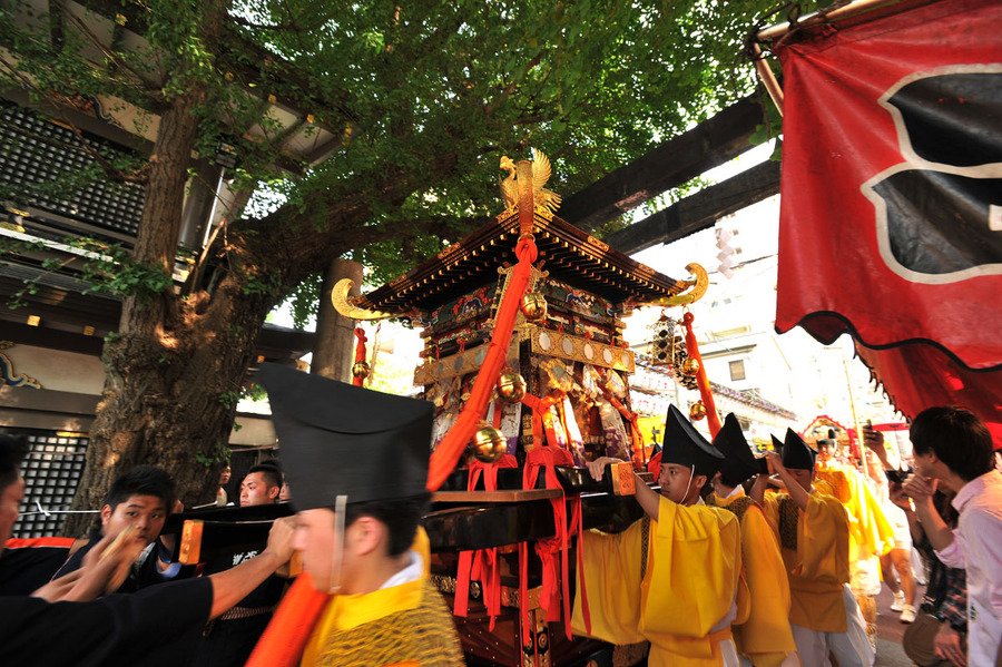 Ключевые атрибуты: Рикутогё — сухопутная процессия. Масштабное шествие из 3000 человек в традиционных костюмах. Его возглавляют барабанщики и колоритные персонажи, включая длинноносого гоблина (Сарутахико). Центральный элемент — вынос богато украшенных паланкинов (микоси), служащих временным святилищем для духа божества. Фунатогё — речная процессия. Участники и микоси переносятся на флотилию из 100 лодок. Среди них есть лодки-сцены, на которых разыгрываются театральные представления. Фейерверк. Кульминация праздника — грандиозный фейерверк, который запускают над рекой.