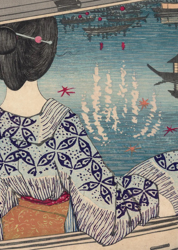 Фейерверки на Сумиде создают атмосферу летнего очищения и памяти. Сегодня этот ритуал воспринимается как городской символ единства. В укиё-э можно увидеть ось небо-река-город, дополненную дугами залпов и их отражениями, вертикалями флагштоков и мостов, лодочными огнями и плотными силуэтами зрителей. Цветовая палитра представляет собой тёмную ночь, освещённую тёплыми вспышками золота и алого. Фестиваль превращает город во временный храм под открытым небом, где свет и вода связывают память о прошлом с коллективной радостью настоящего.