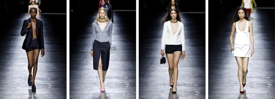 Визуально эта одновременность становится особенно очевидной в подборках одного сезона: в одной коллекции соседствуют трикотажные комплекты, отсылающие к 1970-м, острые плечи и глянец 1980-х, «чистые» линии 1990-х и low-rise/мини-силуэты Y2K.