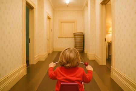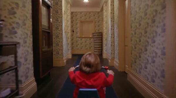 Трекинг-шот в сцене, где Дэнни Торранс катается на велосипеде по коридорам отеля «Оверлук» в фильме Стэнли Кубрика «Сияние» (1980), выполняет несколько важных художественных и психологических функций.