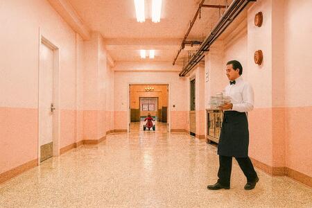 У Андерсона зритель, как и сам Зеро, впервые переступающий порог отеля, внезапно попадает в особый, замкнутый мир, живущий по своим собственным законам. Камера следует за персонажами, проводя их сквозь оживлённые залы «Гранд Будапешта». Зеро едва поспевает за опытным управляющим, месье Густавом, который, в свою очередь, прибавляет шаг, чтобы не отстать от камеры. Всё происходит на ходу: отель уже работает, не останавливаясь ни на секунду. Подписать документы, обменяться парой фраз с постояльцами, провести собеседование — месье Густав не задерживается ни на мгновение. Именно эту динамику и передаёт движение камеры: оно подчёркивает безостановочный, почти механический ритм жизни отеля.