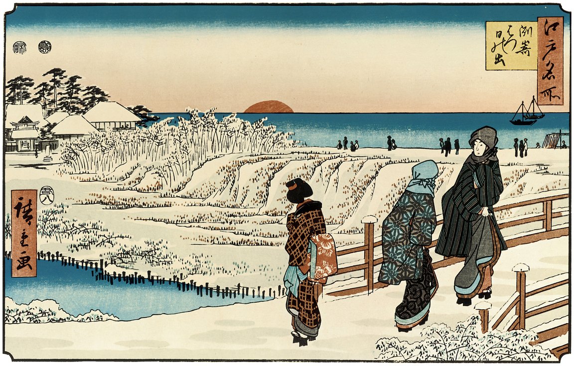 Рюрюкё Синсай, «Суши и новогоднее саке», ок. 1810 [77]; Утагава Хиросигэ, «Восход Нового года в Сусаки», 1853 [78]