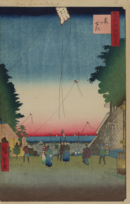 Яшима Гакутей, «Куртизанка Хитофудэ из Тамая со свитой на пути к первому письму Нового года», ок. 1825 [79]; Утагава Хиросигэ, «Касумигасэки», № 2 из серии «Сто знаменитых видов Эдо», 1857 [80]