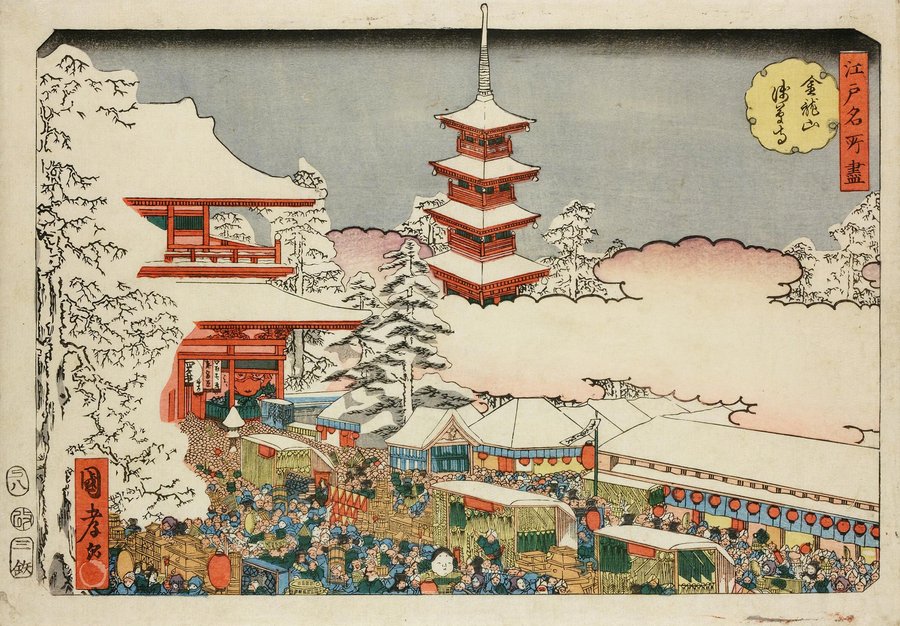 Утагава Кунисада I, «Знаменитые места Восточной столицы: ярмарка в конце года в Асакусе», 1854 [69]