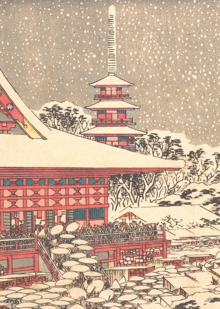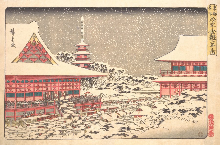 Утагава Хиросигэ, «Новогодняя ярмарка в храме Кинрюдзан», ок. 1836 [70]; Утагава Кунитака, «Кинрюзан Асакуса-ичи» 1857 [71]; Утагава Хиросигэ, «Асакуса Кинрюсан Тоси-но Ичи», ок. 1838 [72]