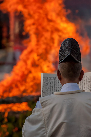 Юджин Хосико, «Высокопоставленный монах счастливые бобы во время ежегодной церемонии мамэ-маки», 2025 [88]; Джеффри Фридл, «Пылающие горячие песнопения», 2012 [89]