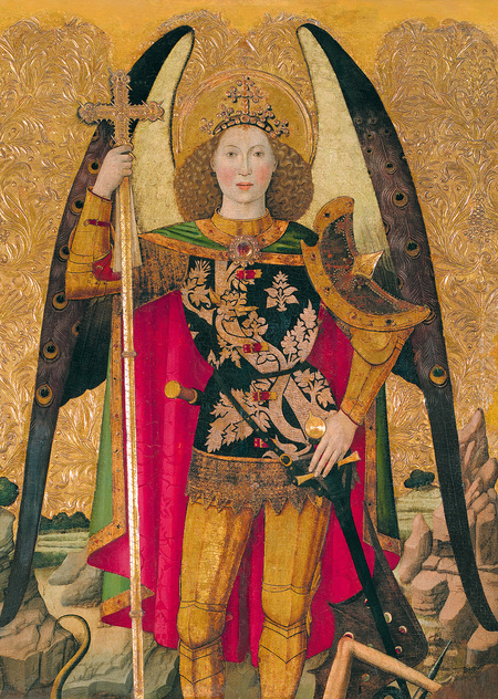 Слева: Хауме Феррер. Святой Иероним за занятиями. Алтарь Святых Иеронима, Мартина и Себастьяна (фрагмент). Ок. 1450. Справа: Жауме Уге. Архангел Михаил. Ок. 1455–1460