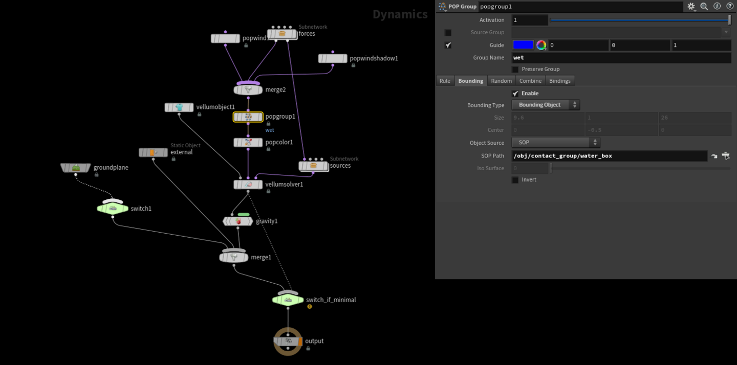 Далее нужно разблокировать редактирование солвера для сухих волос и найти dopnetwork, в котором создать группу точек «wet» с ограничением по water_box (в разделе bounding с SOP-path).