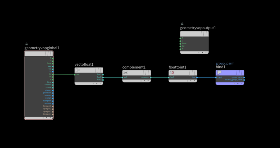 Создаем атрибут Cd по группе wet, меняем его тип на Vector и выставляем значение по всем осям на 1. И дальше этот векторный атрибут переводим в целые числа (int) на VOP-контексте, чтобы вернуть его в качестве группы parm.
