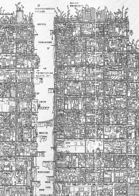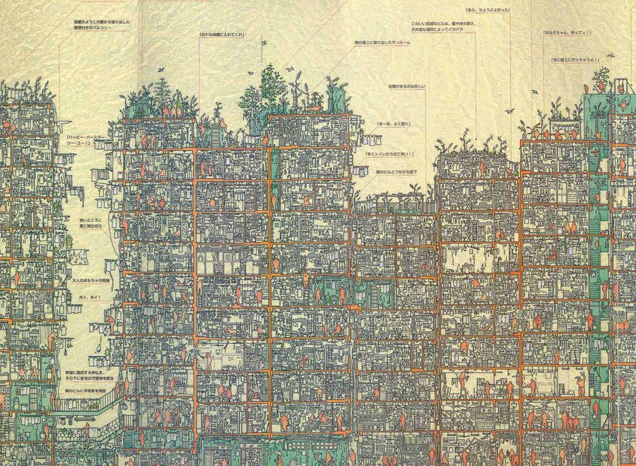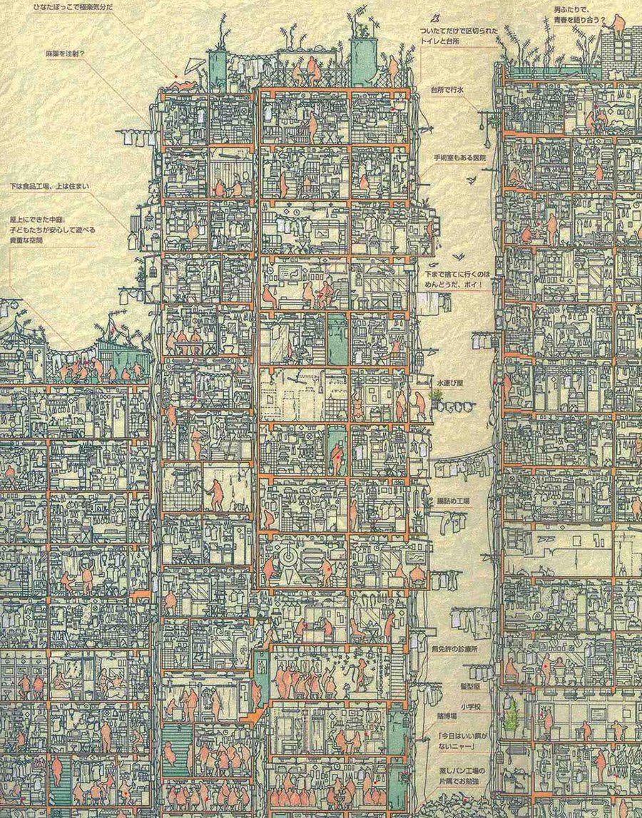 Город стал настоящим лабиринтом. Стихийные постройки, не контролируемые властями или какими-либо законами и правилами, нарастали друг на друге, собираясь в единый организм. Всего на территории поместилось около 400 домов, а также более 1000 мелких производств.