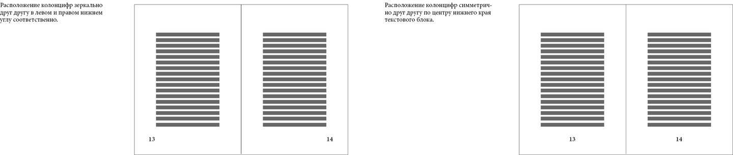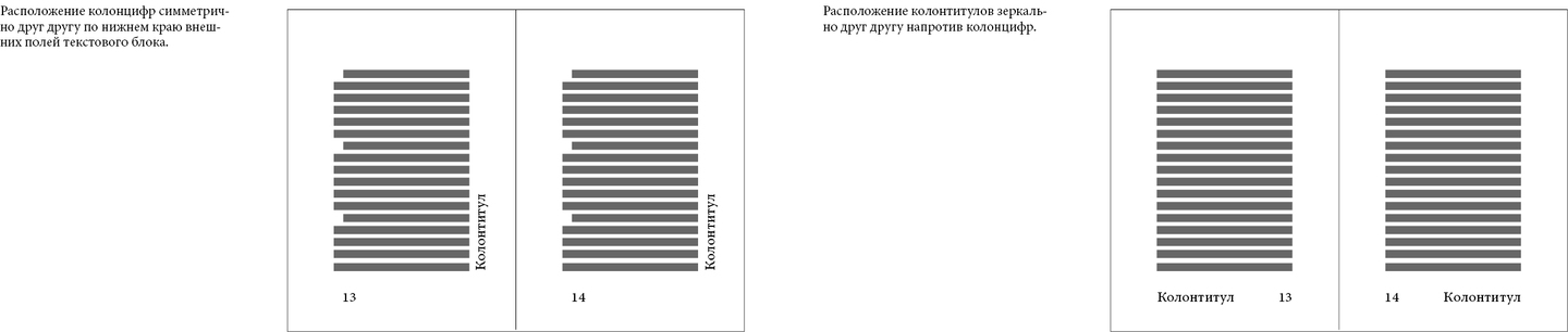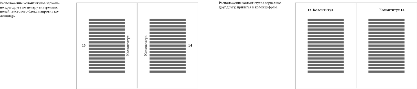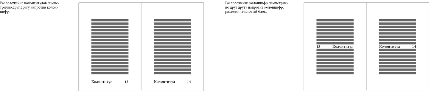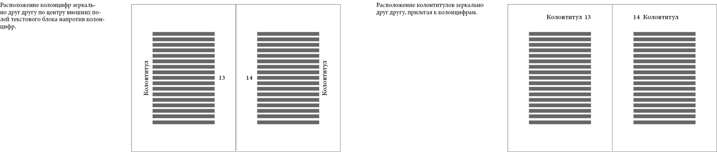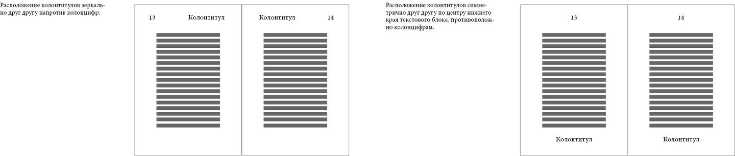 Примеры расположения колонтитулов вместе с колонцифрами, фрагмент из печатного издания визуального исследования. Примеры набраны самостоятельно.