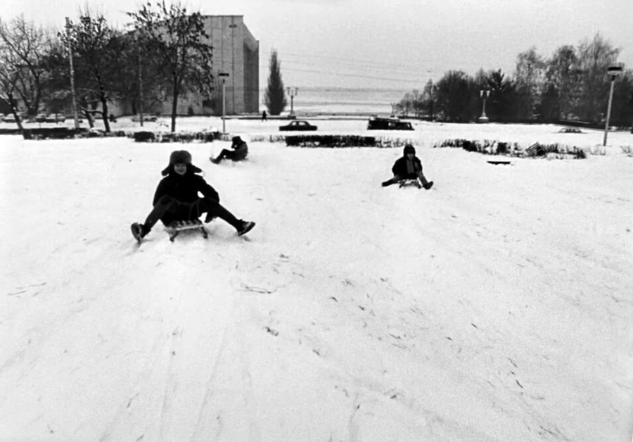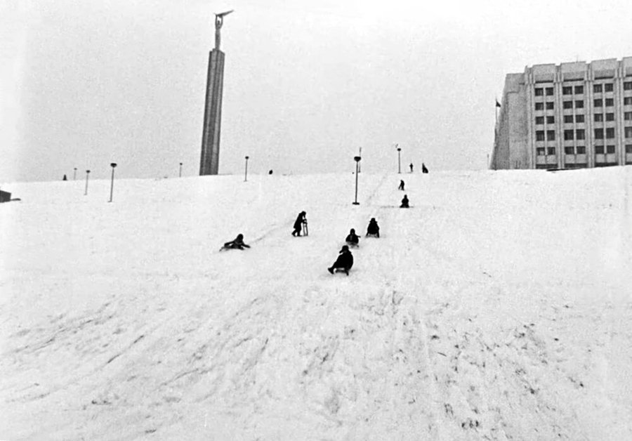 [1-2] Катание с горки у набережной р. Волги и Монумента Славы; г. Куйбышев; 1990 г.