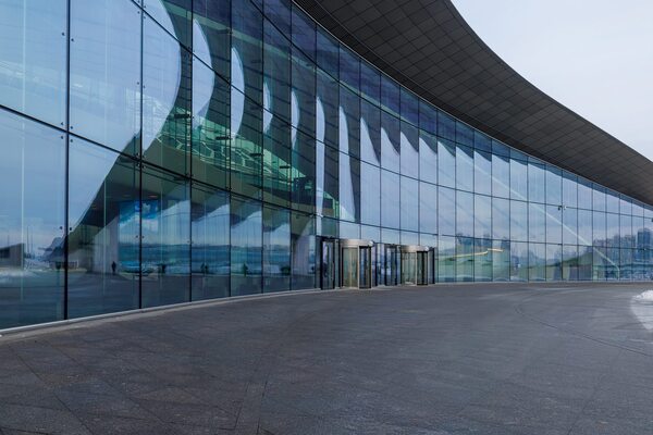 Фасад состоит из многих тысяч холодногнутых стеклянных панелей. Панели создают впечатление невесомой, гладкой оболочки, «отражающей небо и облака». Однако физически система очень массивна: каждый модульный элемент весит около 740 килограммов, а весь фасад — около 210 кг/м². Более того, эта «легкая» стеклянная оболочка выполняет сложнейшие инженерные функции: ветровые нагрузки, теплозащита, влагостойкость, герметичность. Фасад оказывается и эстетическим объектом и инженерной системой. [1, 4, 8]