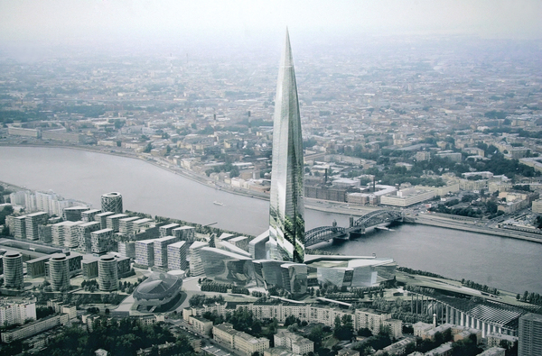 Перенос на окраину города, на намытую территорию у Финского залива, кардинально изменил контекст здания. Высота здания компенсирует удаленность, а форма делает его узнаваемым на больших расстояниях.
