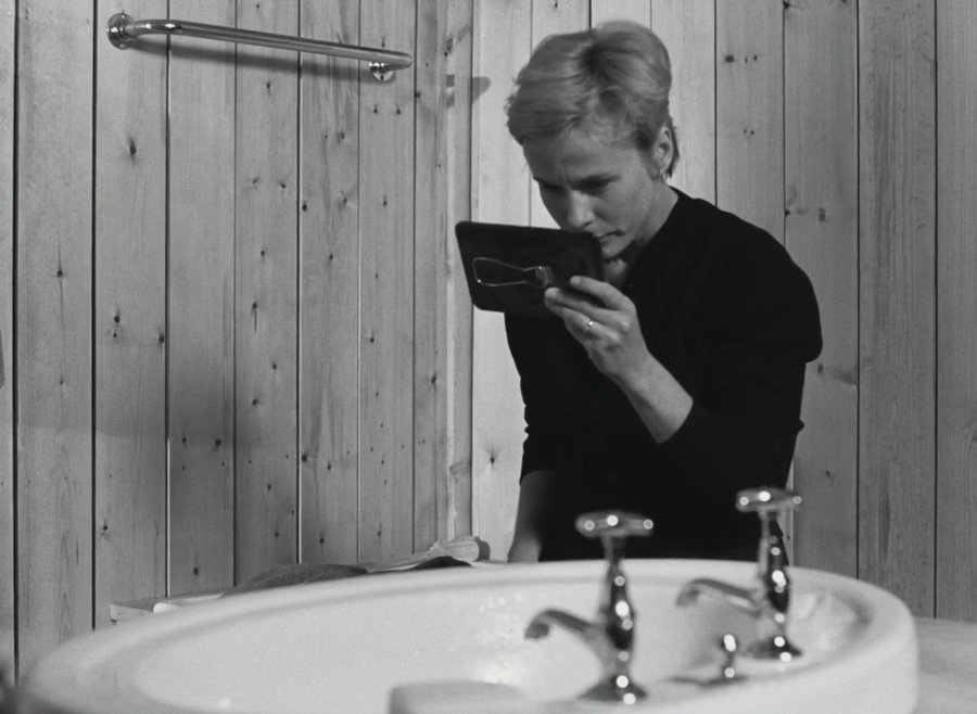 В «Персоне» 1966 г. лицедейство появляется в сцене, когда Альма видит черты Элизабет в своем отражении. Героиня пребывает в истерике, но затем, видя своё отражение снова, начинает с большим интересом и довольством смотреть на себя. Это может говорить о притворном характере её эмоций, попытке убедить себя в том, что она не желает походить на Элизабет, но слиянии личностей уже не остановить.