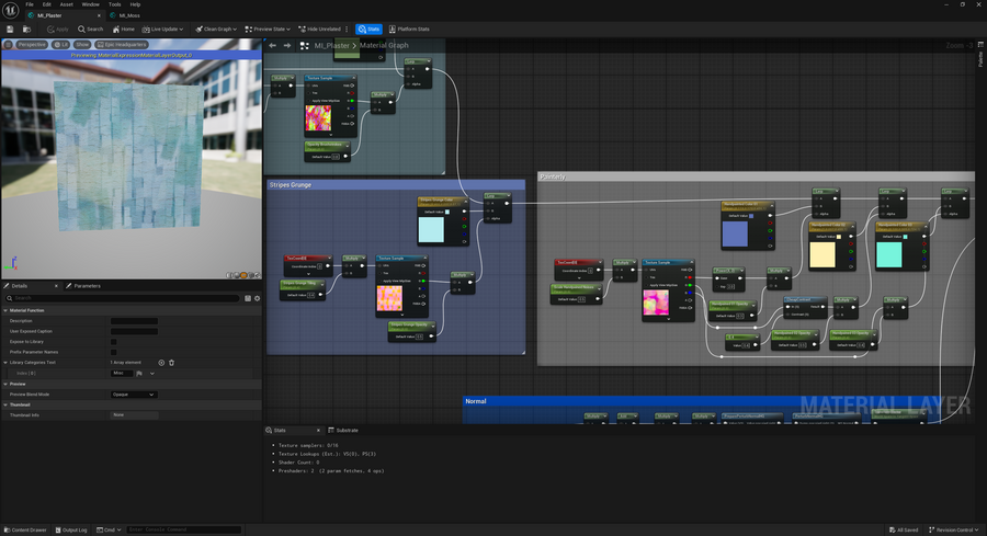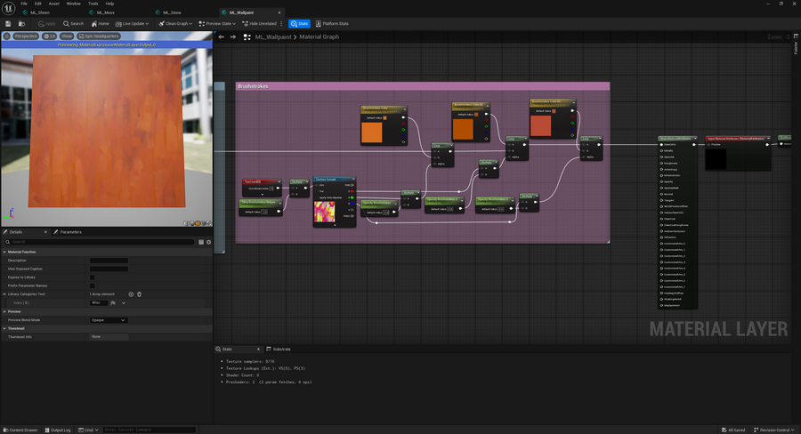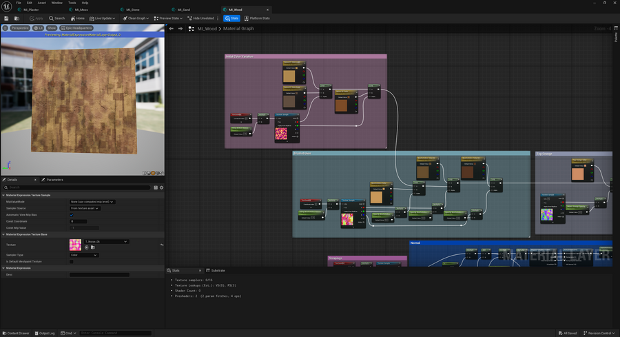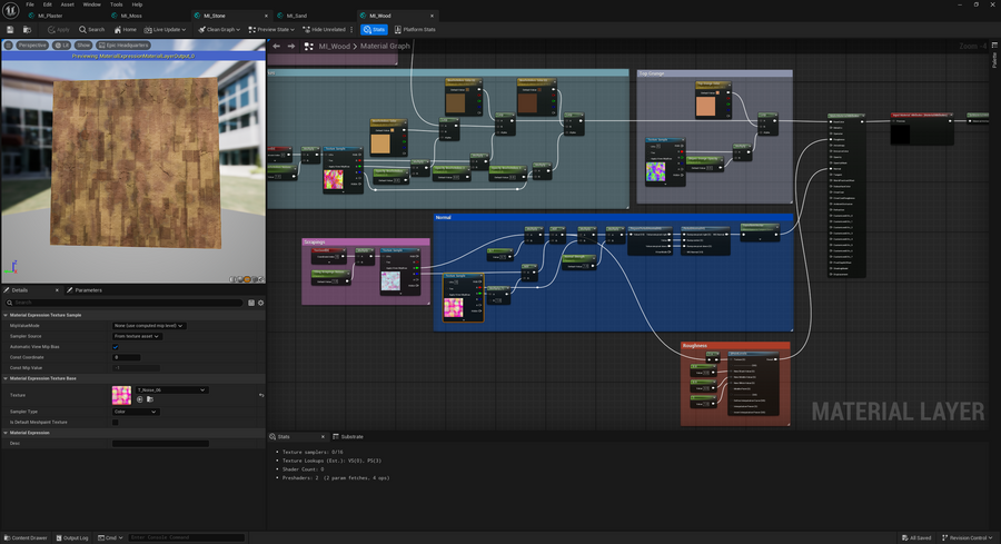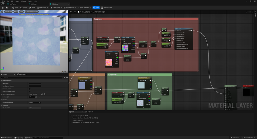 Основная работа над созданием environment artа в рамках этого исследования проходит в Unreal Engine 5, поэтому часть работы по созданию текстур стремится к тому, чтобы быть собранной «в движке». Для этого применяется система Material Layering на базе UE5.