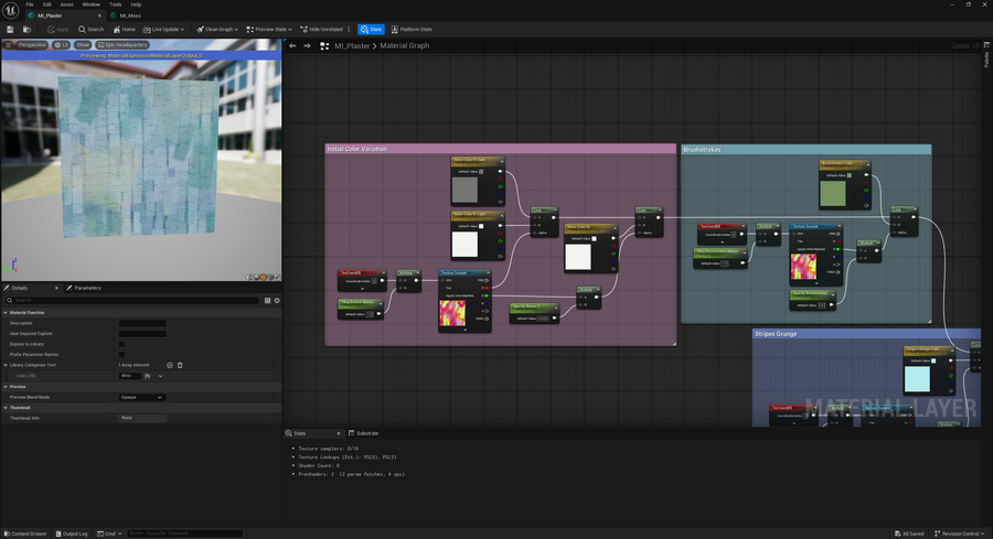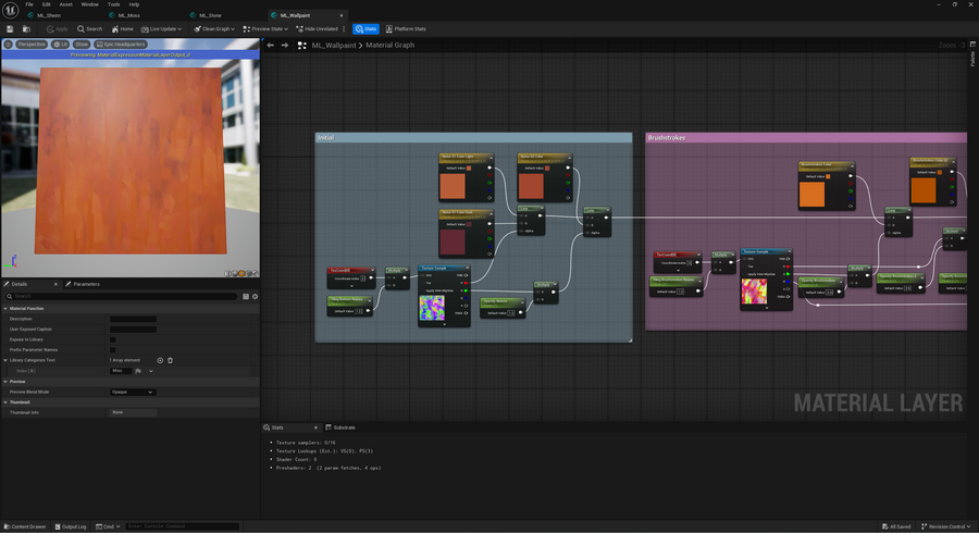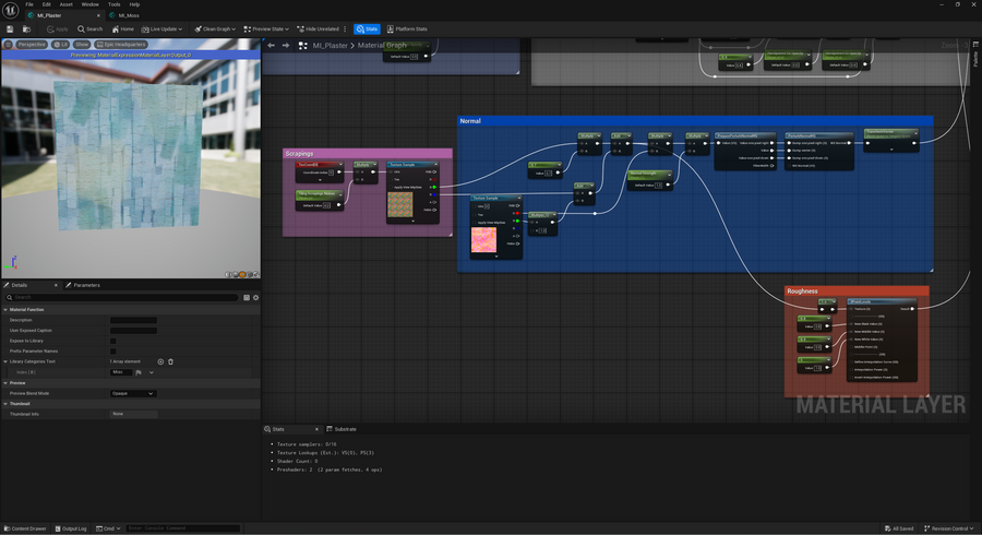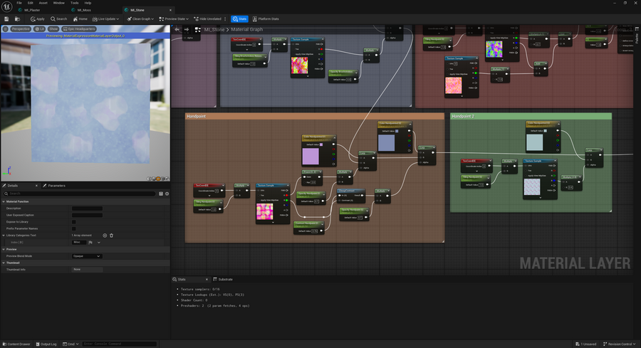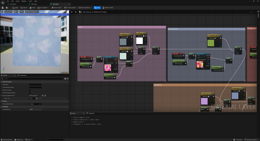 Для того, чтобы сделать слои более комплексными и текстурными, в Material Layer с помощью карт шумов, предварительно сгенерированных в Substance Designer, можно собрать несколько «мазков», дополнительно добавляя к ним скалярные параметры, такие как Tiling, Contrast, Opacity, а также цвет. Таким образом, впоследствии в панели Layers Parameters в Material Instance я могу менять размер «мазков», их цвет и контрастность. Это главное преимущество Material Instance, которое позволяет делать процесс создания локации в Unreal Engine быстрее и комфортнее.