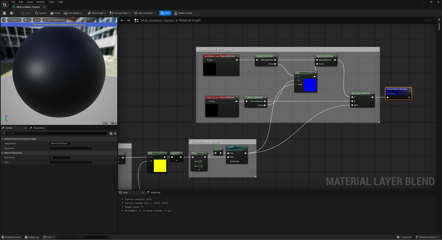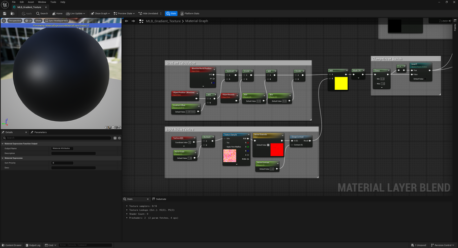 Простой Material Layer Blend (далее MLB) представлен в виде обычного градиента, который смешивает два базовых слоя (белый и синий), и, при помощи рулек в Material Instance и добавленных скалярных значений Add и Blur, два слоя смешиваются через градиент.