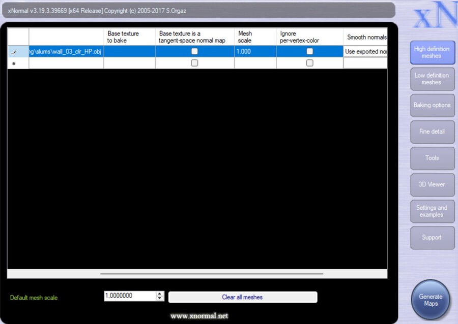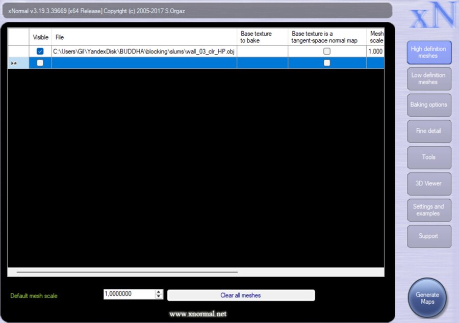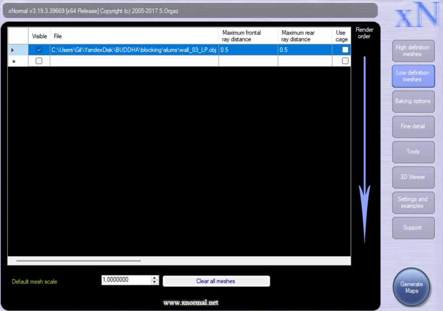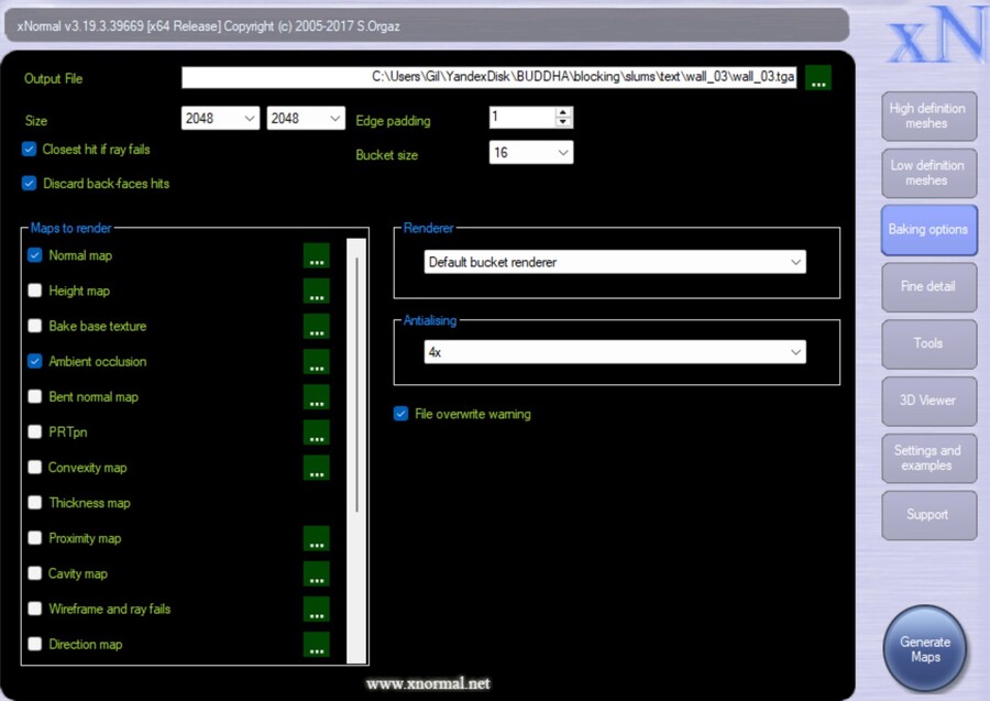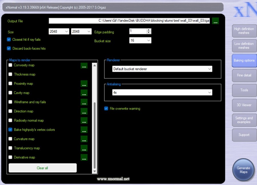 Затем использовалась простая программа xNormal, специализирующаяся только на запекании текстур. Ее интерфейс интуитивно понятен и прост. Необходимо добавить высокополигональную и низкополигональную модель и выбрать карты, которые нужно запечь.