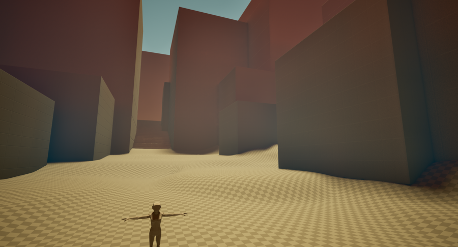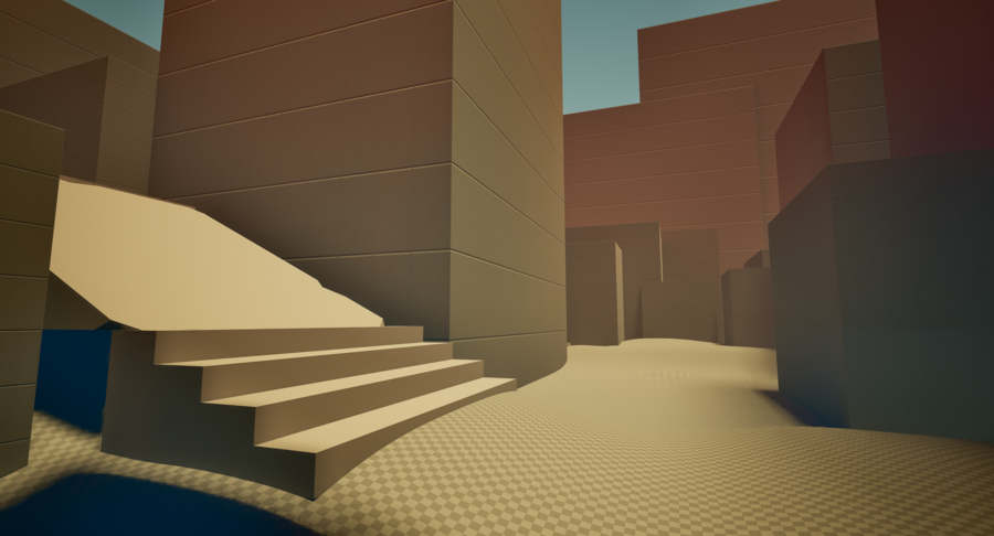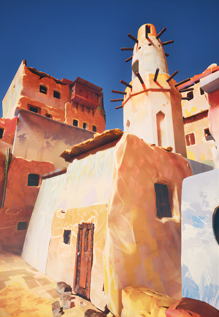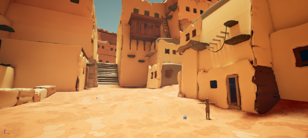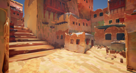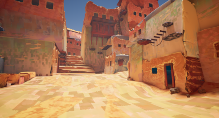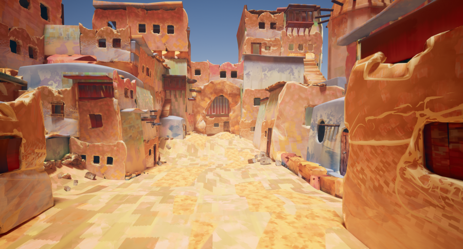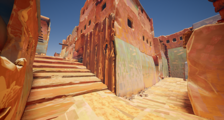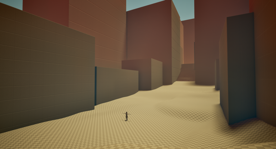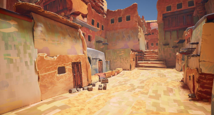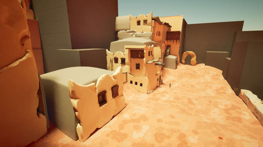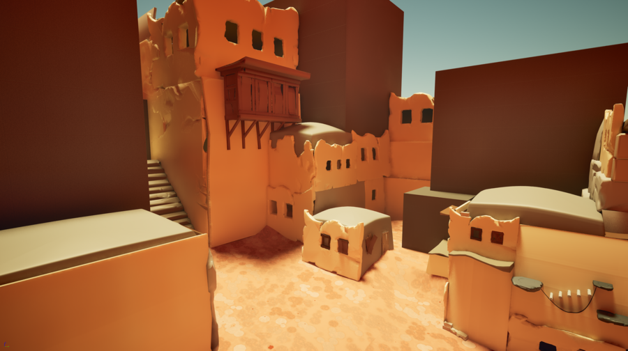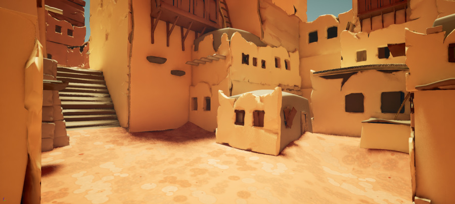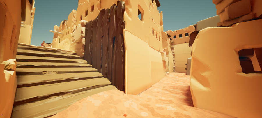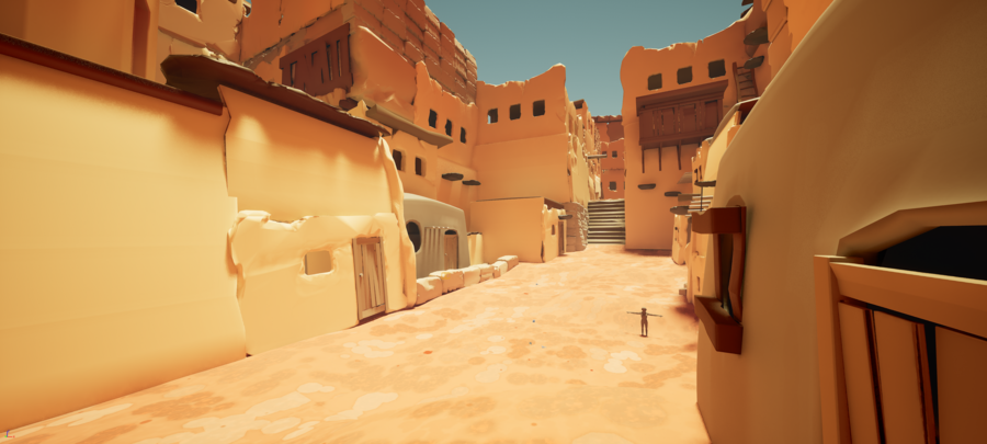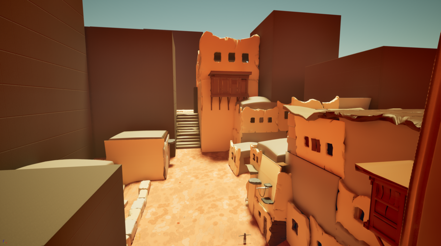 В процессе работы с Material Layers была собрана локация трущоб. Они состоят из модульных старых песчаных домов, которые больше похожи на муравейники или другие природные образования, не созданные человеком. Над главным героем нагромождаются высокие человейники и руины, в которых все еще кто-то живет, поэтому блокинг производился огромными кубами.