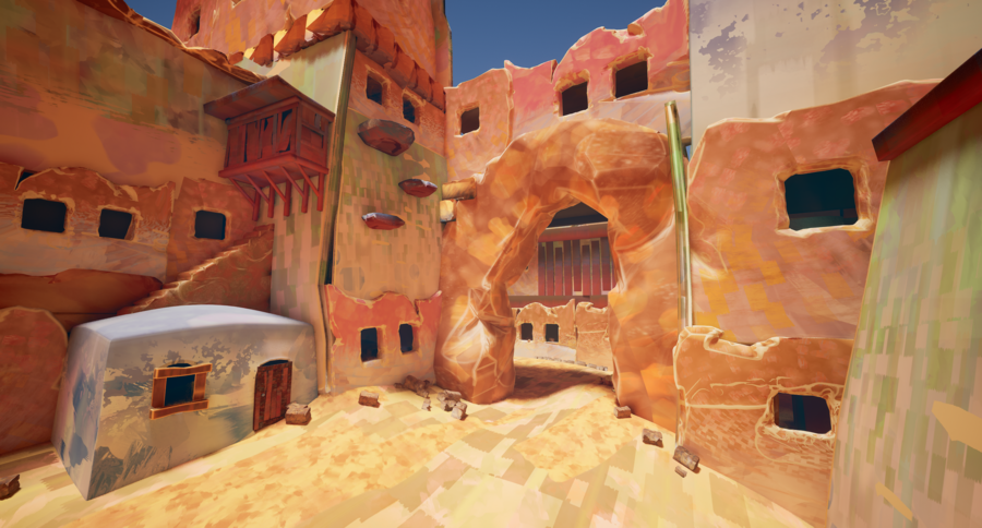 Заготовленный ассет пак из модульных мешей позволил быстро заполнить локацию необходимыми зданиями и образованиями и при этом сохранить масштаб и стилизованность.