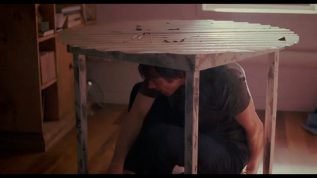 В сценах из детства пространство вокруг героя становится другим. Мы видим мир таким, каким его воспринимает маленький ребёнок. Джоэл сидит под столом, который кажется ему огромным, Клементина выглядит великаншей, а обычные кухонные предметы искажены до неузнаваемости.