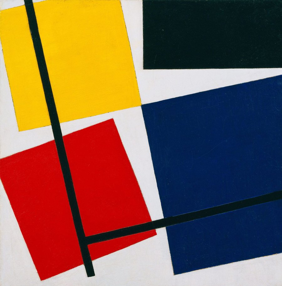 Особое значение имела красно-сине-желтая триада как минимальный набор базовых цветов, из которых строились все остальные. Она стала популярной, потому что сочетание трех принципиально разных цветов создаёт визуальный баланс, позволяет формировать гармоничные, читаемые и динамичные композиции. Эта схема структурировала пространство, задавала ритм модулей и позволяла экспериментировать с контрастом без утраты целостности формы, а также напрямую ассоциировалась с базовыми формами: квадрат, круг и треугольник[12].