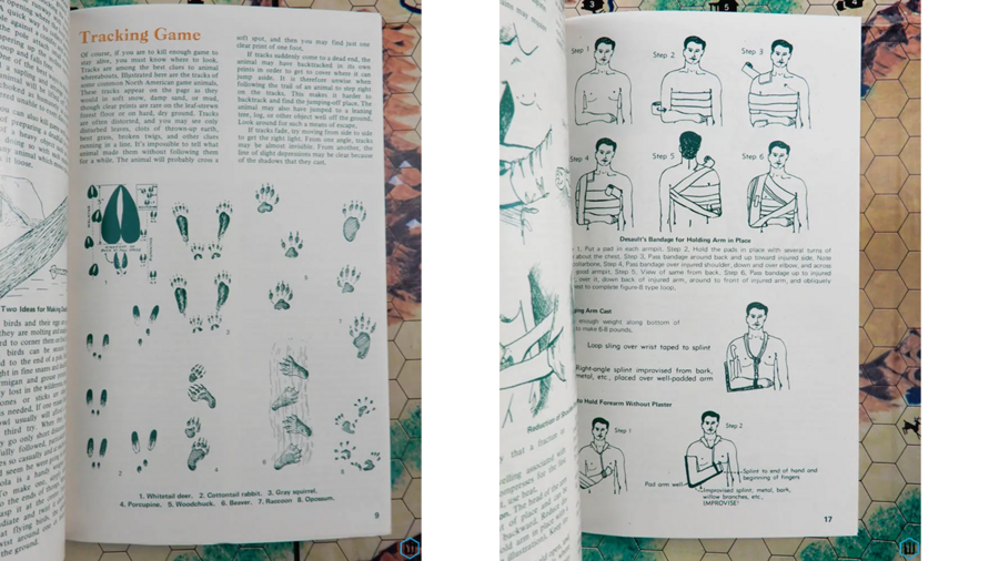 В руководствах по выживанию нет прошлой стандартизации, а визуальные элементы направлены на обучение и демонстрацию действий при опасных ситуациях. Присутствующая верстка более гибкая и «наглядная».