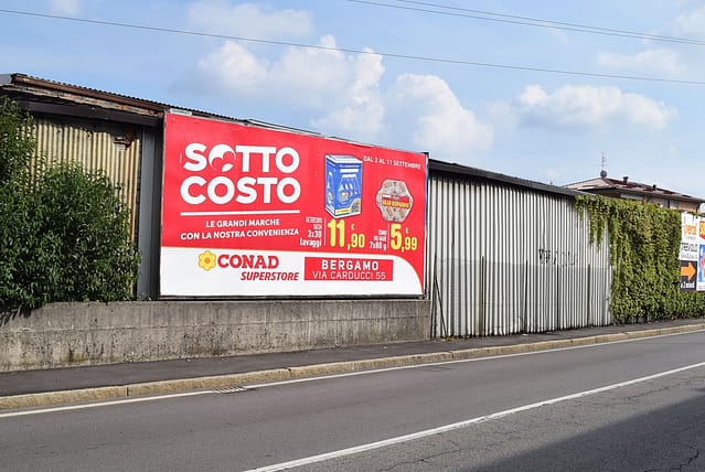 Во всех странах в супермаркетах часто используются узкие, вытянутые в высоту гарнитуры. Возможно, это связано с их практичностью: так длинные фразы проще уместить на нужном формате. Антиквы и курсивные шрифы используются чаще всего в магазинах Рима, работая как в основном тексте, так и в акцентах.