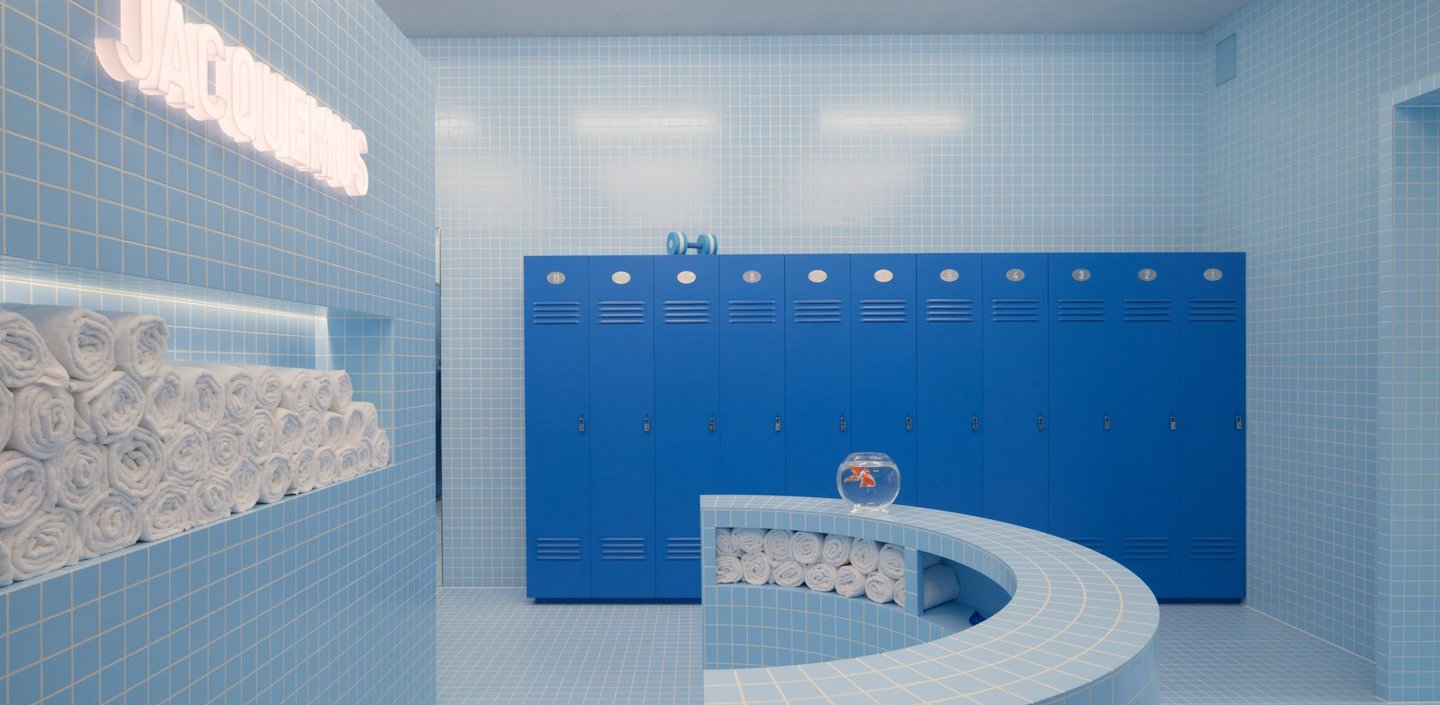 3. Третье пространство, Le Vestiaire, находилось в здании бывшего отеля Selfridges на территории универмага. Концепция локации была основана на интерпретации раздевалок у бассейнов: посетители могли перемещаться по инсталляции, где предметы интерьера напоминали функциональные элементы спортивных и плавательных зон. Пространство было оформлено с отсылкой к визуальному языку фильмов Жака Тати, что придавало ему кинематографический характер. Проект создавал иммерсивный опыт, объединяя визуальные и тактильные впечатления с возможностью взаимодействия с продукцией бренда.