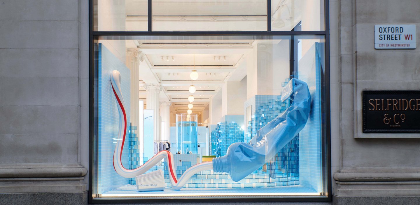 2. Вторая локация, называемая Corner Shop, представляла собой более крупное творческое пространство внутри самого универмага. Здесь экспонировались женская одежда, аксессуары и текстильные изделия Jacquemus. Визуальная организация включала увеличенные предметы быта: макет тюбика зубной пасты, раковины и большой стакан воды. Эти элементы служили фоном для демонстрации продукции, создавая интерактивное пространство, в котором покупка сочеталась с визуальным опытом. Цветовая гамма была выдержана в характерных для серии оттенках синего.