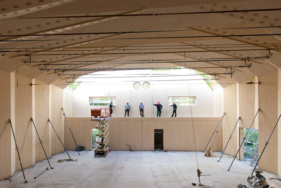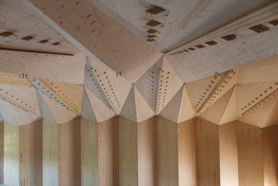 Павильон — прототип новой деревянной конструкции с взаимоблокирующими соединениями «дерево‑дерево». Проект, созданный по технологиям IBOIS, учитывает ограничения площадки, контроль бюджета и сроков, чистый монтаж и устойчивость, развивая принципы Макса Билла.