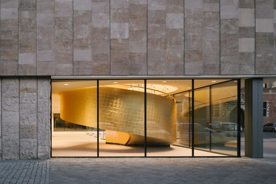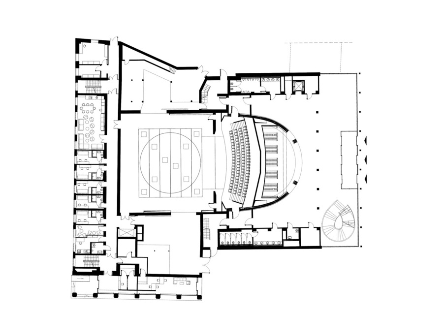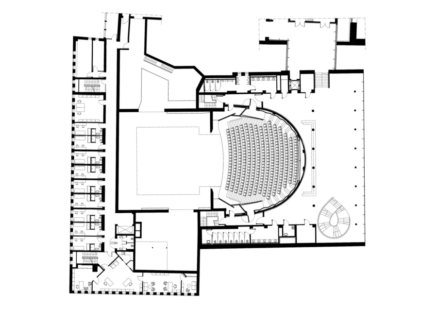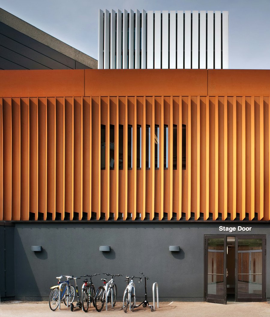 Новый вестибюль объединил мастерские и студии; его алюминиевые фасады ведут диалог с брутальной геометрией Ласдуна, а стеклянная стена демонстрирует работу прохожим. Днем вестибюль и часть театра используется в образовательных целях и работы
