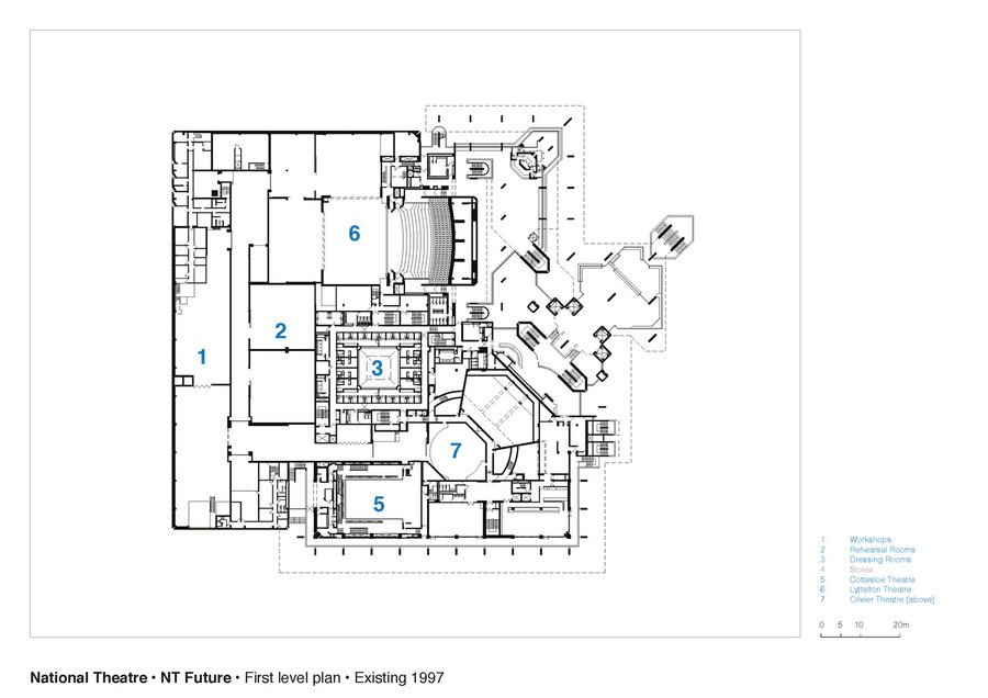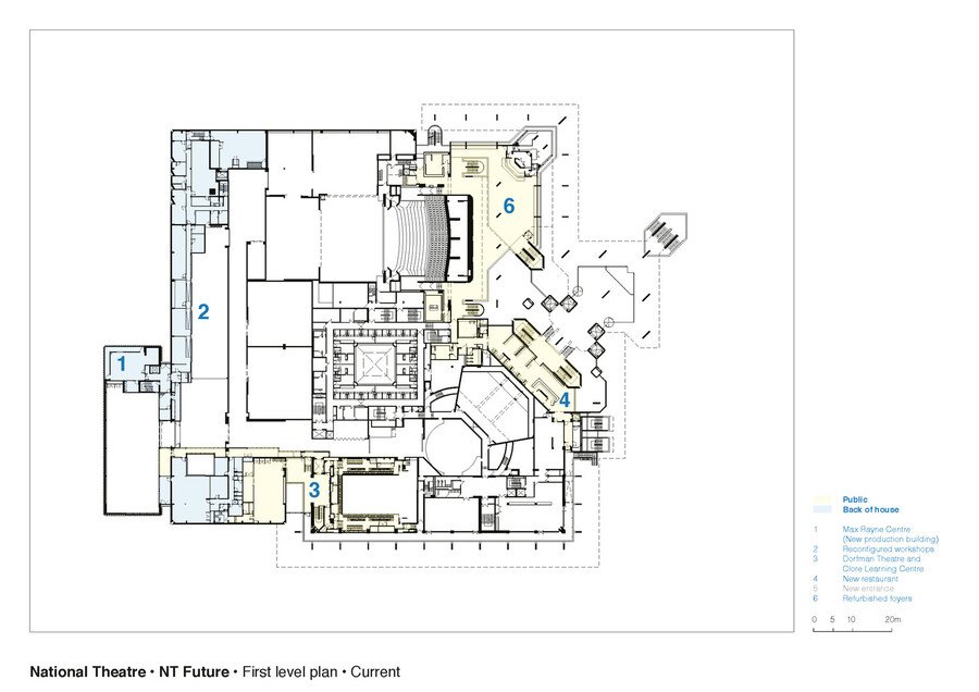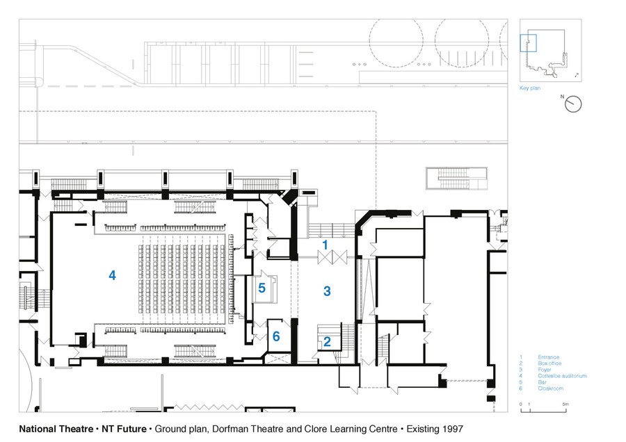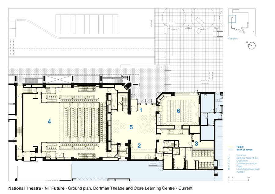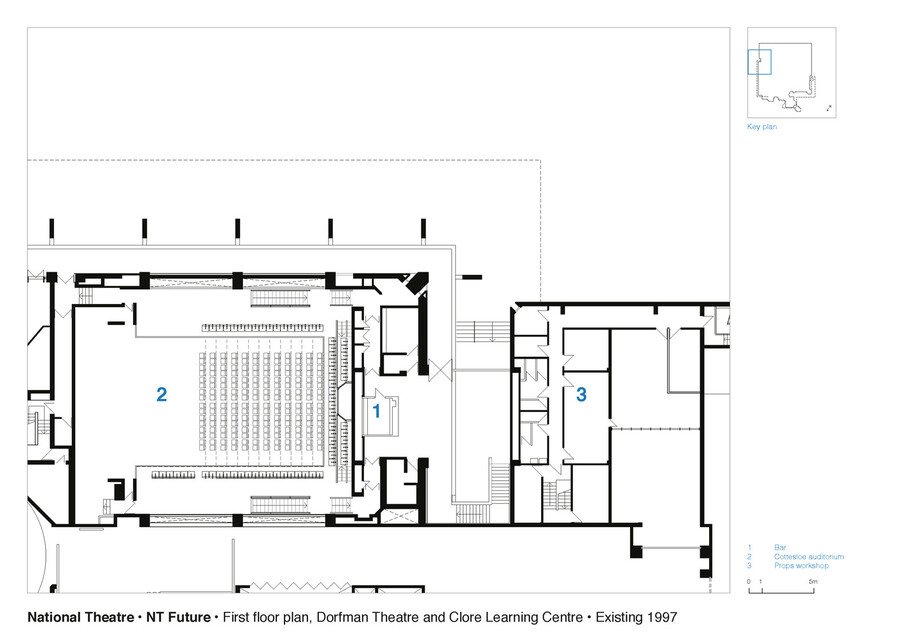 План 1-го уровня, 1977(до реновации)/2015 // План 1-го уровня зрительских зоны залов, 1977/2015 // План 2-го уровня зрительских зоны залов, 1977/2015 / Haworth Tompkins, 2015