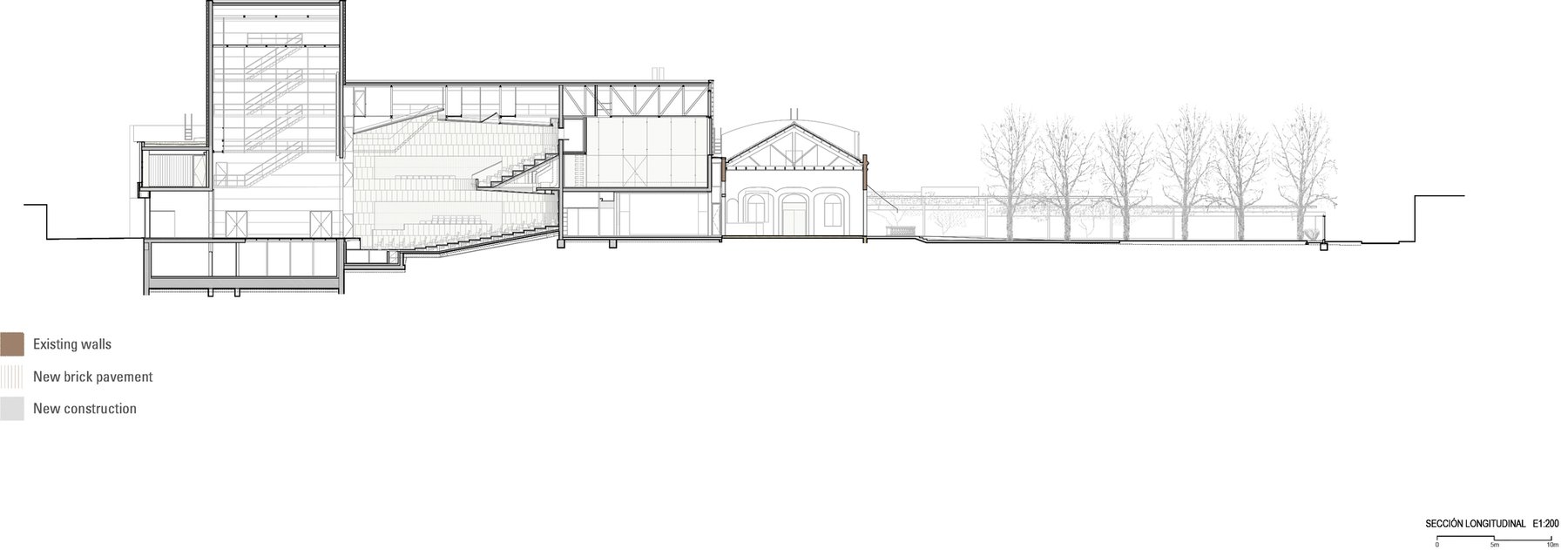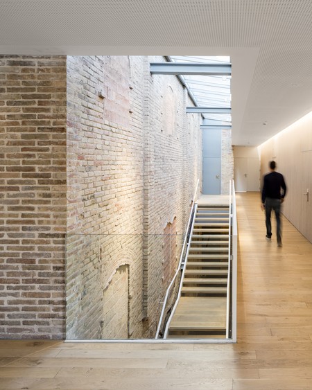Диалог между старым и новым проявляется через тонкий контраст между прежней и современной кирпичной кладкой, а также через различия фактур и оттенков материала.