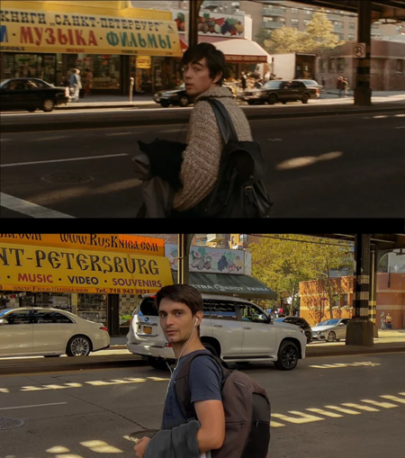 На еще одном важном «гибриде», Брайтон-Бич-авеню, визуальное пространство сжато до предела: вывески, рекламные баннеры услуг создают эффект перенасыщения, близкий к московскому визуальному хаосу 1990-х. Кириллические шрифты, часто с ошибками, соседствуют с английскими надписями, создавая двуязычность.