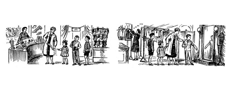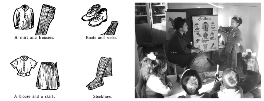 В 1940–1950-е годы иллюстрации носили строгий, гравюрный характер. Это были контурные рисунки с минимальной детализацией, напоминавшие схемы. Основное внимание уделялось предметной наглядности: изображались школьные принадлежности, мебель, доски, столы. Фигуры учеников и учителей появлялись редко, без индивидуальности, с сдержанной позой. Иллюстрации конкретизировали лексику, придавая слову вещественную определённость, а обучение строилось как последовательное усвоение упорядоченного мира вещей. Визуальная строгость подчёркивала рациональную сторону обучения и соответствовала представлению о знании как о труде, требующем сосредоточенности.