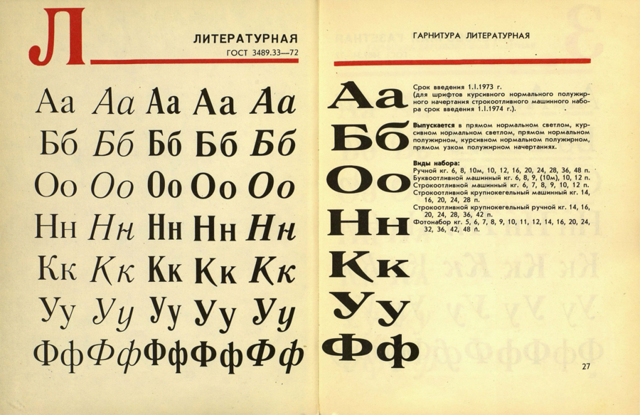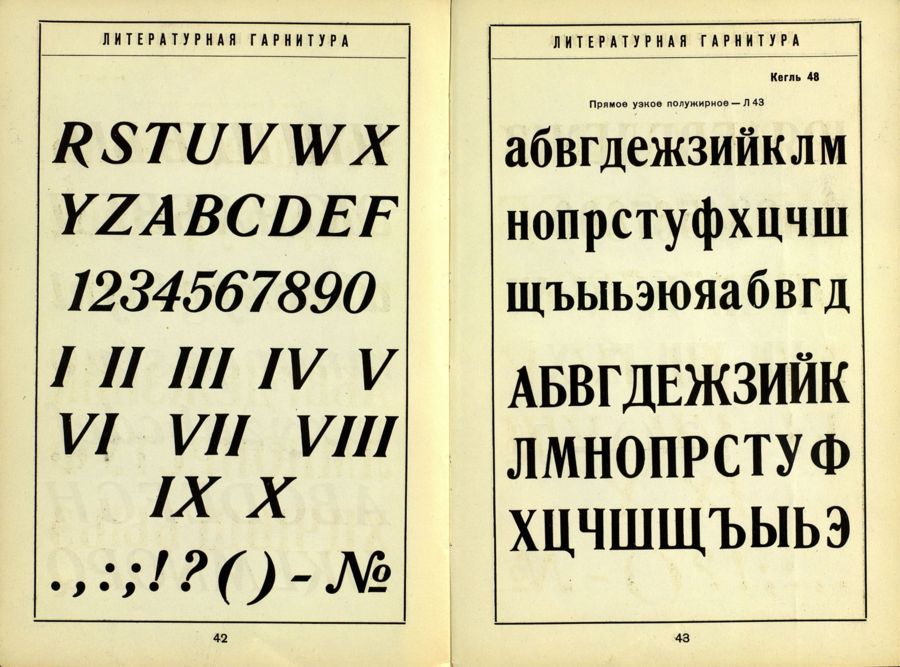 Основной шрифт в советских учебниках середины XX века представлял собой гарнитуры «Литературная» и «Школьная». «Школьная» гарнитура была разработана в 1939 году под руководством художника Черневского с учётом удобочитаемости для детей. Она характеризовалась строгим построением букв, широкими пропорциями, небольшим контрастом между толстыми и тонкими штрихами и преобладанием круглых и квадратных форм, что облегчало восприятие текста. Гарнитура «Литературная», созданная Анатолием Щукиным в конце 1930-х годов на основе немецкого шрифта Lateinisch, использовалась в учебной и научной литературе и обеспечивала чёткость и устойчивость форм для больших объёмов текста. Обе гарнитуры сочетали функциональность и строгую эстетическую стройность, формируя у читателя ощущение порядка, стабильности и уверенности в материале, что соответствовало педагогической логике советских учебников.