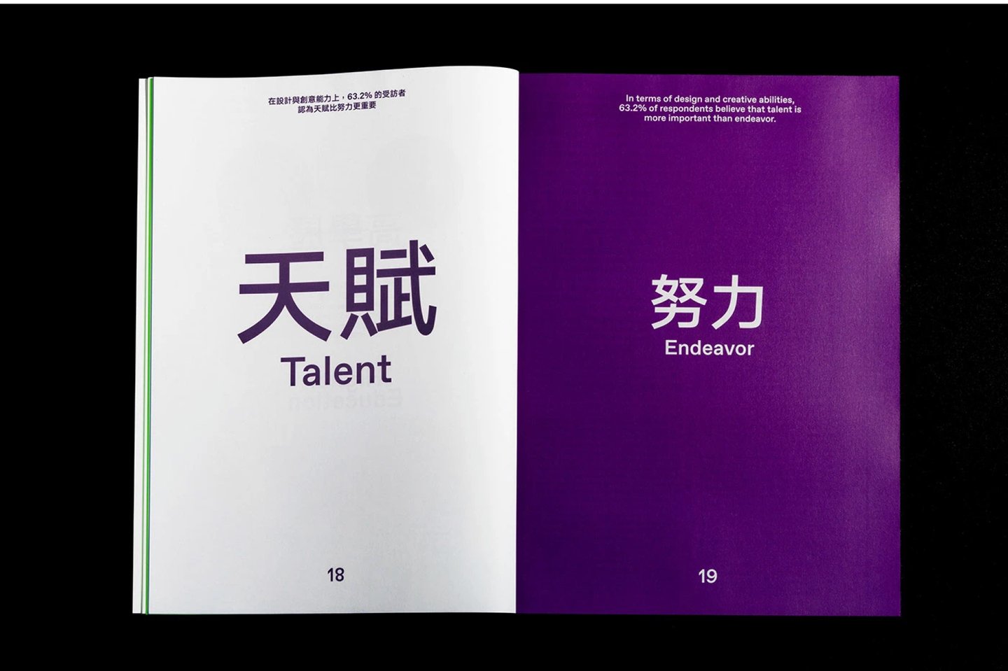 Современная билингвальная типографика Китая совмещает в себе и переосмысление традиций и новые подходы в верстке текстов на двух языках. Так, например, «Ежегодный выпуск 360°» — это журнал, который публикует лучшие дизайн-работы года, но он представляет интерес не только сбором интересных и уникальных проектов, но и своей версткой, которая меняется каждый год в зависимости от темы выпуска. Они используют в верстке разные приемы, тематически оформляют шмуцтитулы, эксперементируют.